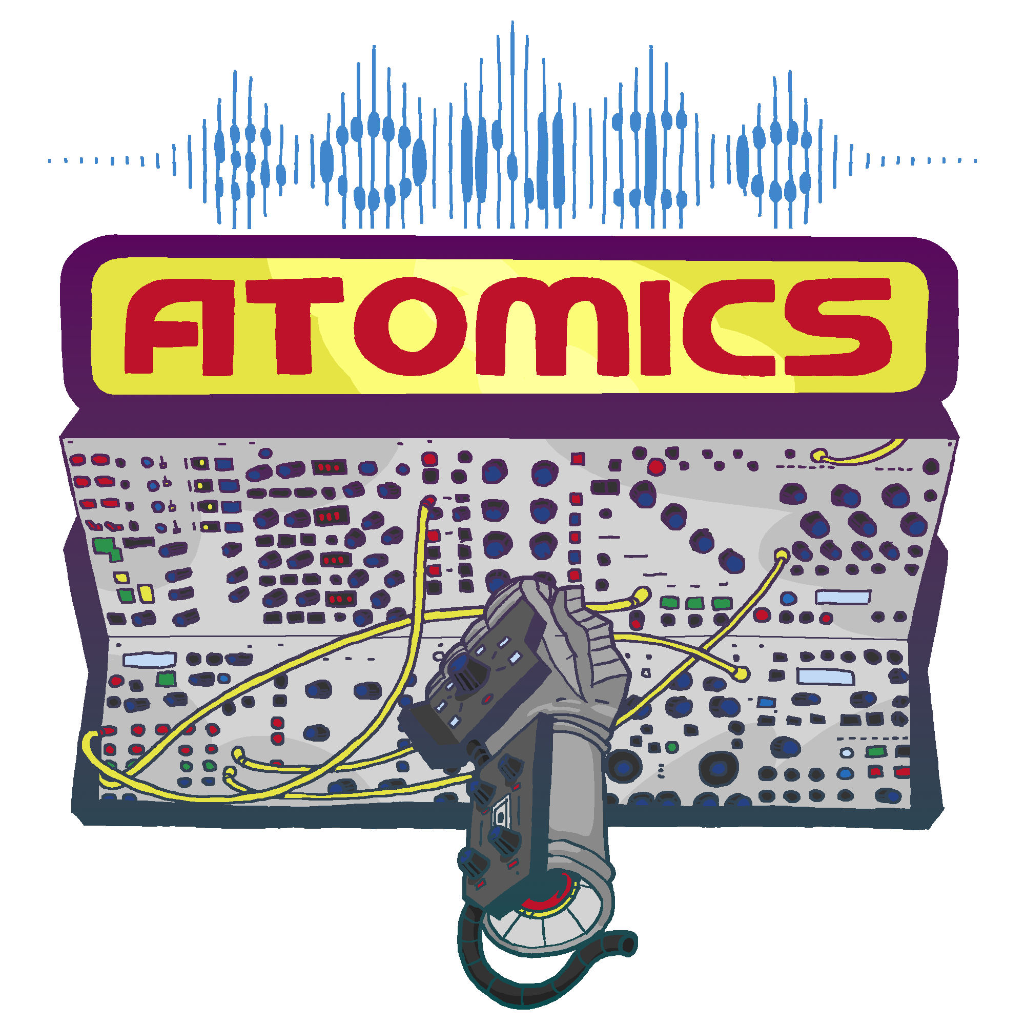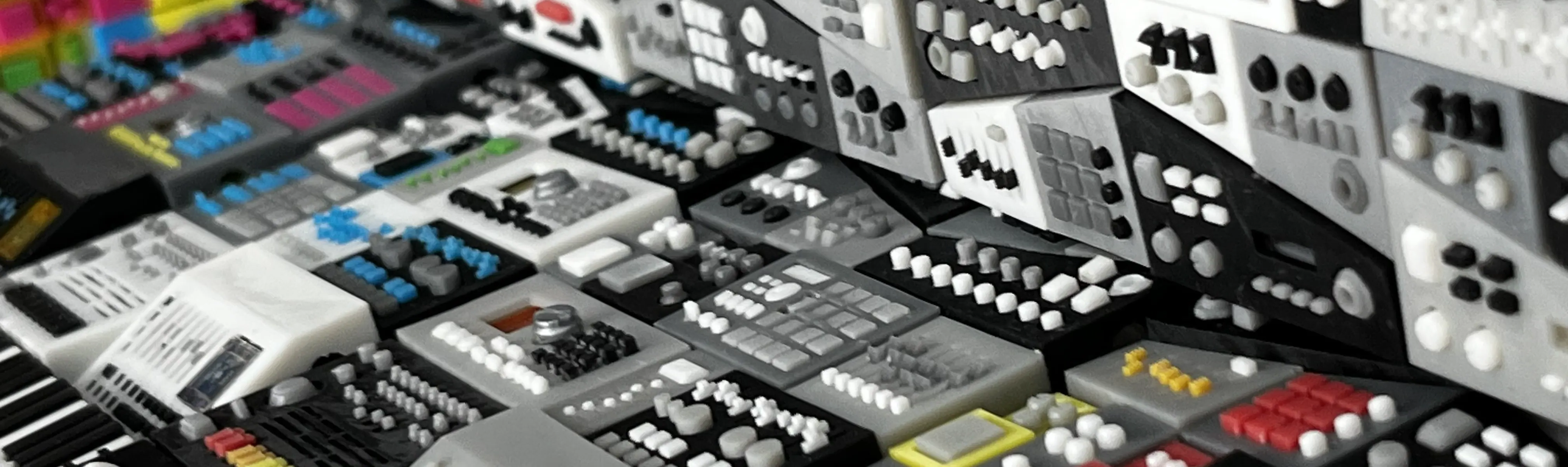 Sold exclusively at Toy Pizza Expo 2025 and briefly online. Glyos and LEGO compatible modular synth toys for 3-4" action figures. 3D printed color-dyed resin with multi-color inset pieces. Includes compatible electrical wire cables. Packaged in a clear audio cassette with LEGO baseplates and a custom die-cut J-card.